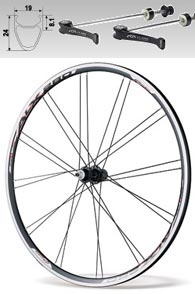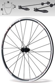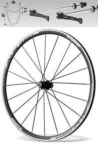 - A-Class "EXA" -Felge - silber-glänzend - 23.7mm Profilhöhe - silber gänzende Naben - VR 20Loch, radial - HR 24Loch, radial (li), 2-f.gekr.(re) - schwarze DT-Speichen - Gewicht: VR 670g, HR 912g - für 9- u. 10fach - mit Campagnolo-Freilauf